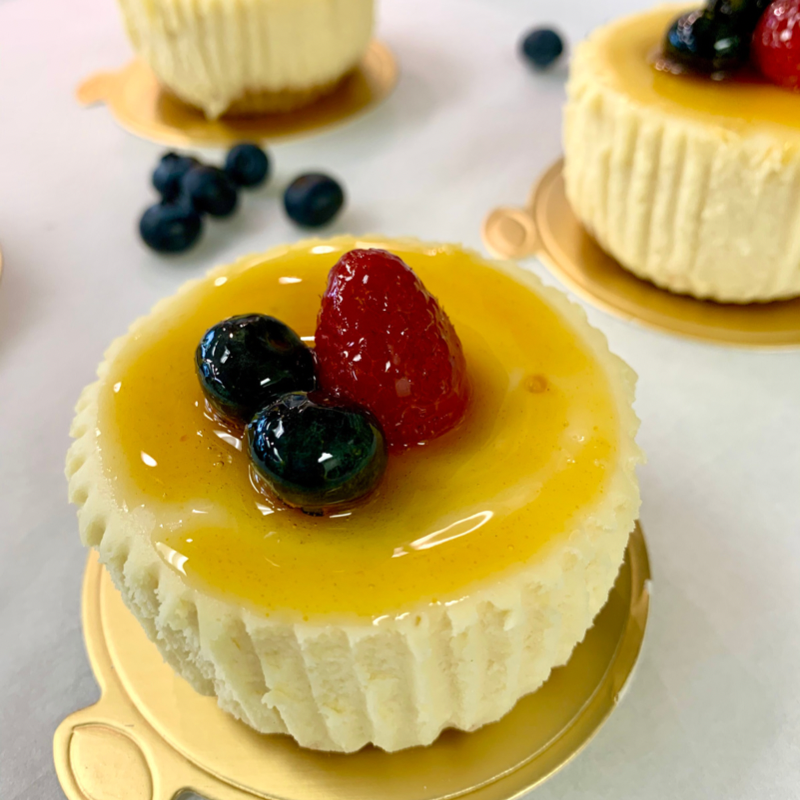 Enjoy our delicious passion fruit cheesecake with a cookie top, made from scratch in our kitchen! Each cheesecake is served with a tangy passion fruit sauce, homemade meringue and fresh fruit.